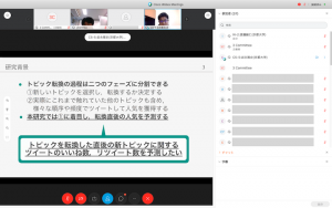 普段からネットで配信を行なっている学生もなかなかいないため,ツールの使い方に少々手間取ってしまった場面がありましたが,無事に発表を終えることができました.