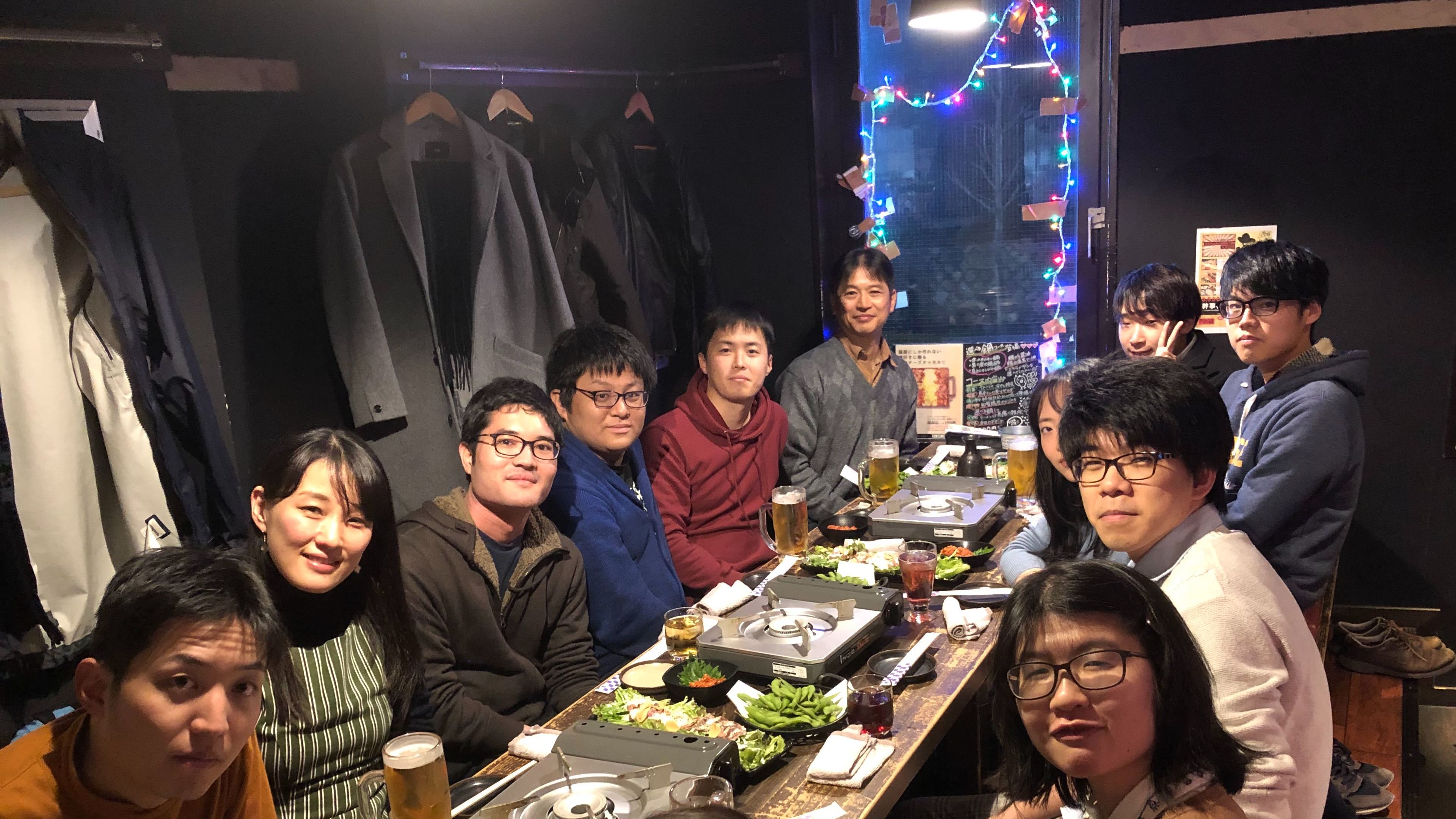 学会への論文提出を終えて 2019.1.15 #party #new year party 3月に多くの学生が発表する学会への論文提出を終えて,一息ついたところで,新年会を開きました.この後,4回生は卒業論文提出,修士1回生は修士論文中間発表,修士2回生は修士論文提出が控えていますが,皆,学会への論文提出が無事できたのでだいじょうぶでしょう. << previous:片岡大祐君と京塚萌々さんが Web Intelligence に関する国際学会IEEE/WIC/ACM Web Intelligence 2018で研究成果を発表 6名の学生が電子情報通信学会DEIM2019で発表をし片岡大祐君と佐々岡哲哉君が賞をいただきました:next >> tags#AnimalCrossing #avoidingBaseballToKeepGolfSwingPosture #baseball #basketball #beer #blumen hugel #bookworm #butPlyaingGolfNow #can take photos #catcher #cause studying image processing #conference presentation at Germany #conference presetation at Chile #creator #drummer #dynamoRoller #ex-highschool-baseball-player #ex-Kumano-ryo-er #fashinable #fluent Japanese speaker #graduated university in Japan #guitar #KU-unplugged #KyotoUnivCanoeClub #kyoudai-kobo #miffy #miffyMiffy #No it's Lawson #often wearing a mask #Paul Bocuse #Photo looks like a fisherman #photo taken by herself #race walking #ramen #Regallily #Sagawa delivery guy? #singer #splatoon #sukiyaki #typer #walker #whiteboardArtist #wine #writer #X match (as for area)